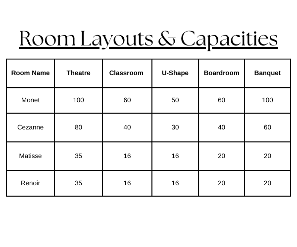 The Matisse and Renoir Suites are identical in size and feature interconnecting doors, allowing the rooms to be used individually or combined if required. These rooms are ideal for board meetings, small training sessions and private business meetings for up to 20 delegates.